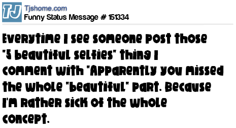X says Everytime I see someone post those "5 beautiful selfies" thing I comment with "Apparently you missed the whole "beautiful" part. Because I'm rather sick of the whole concept.