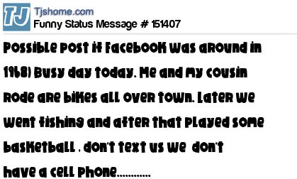 X says Possible post if Facebook was around in 1968) Busy day today. Me and my cousin rode are bikes all over town. Later we went fishing and after that played some basketball , don't text us we don't have a cell phone............