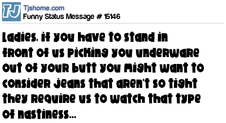X Ladies, if you have to stand in front of us picking you underware out of your butt you might want to consider jeans that aren't so tight they require us to watch that type of nastiness...