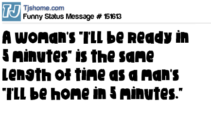 - # 89052 its hard not to notice that a woman's "I'll be ready in 5 minutes" and a man's "I'll be home in 5 minutes" are exactly the same!