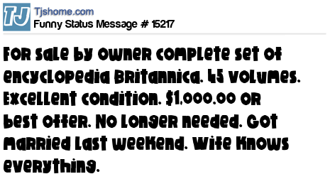 - # 59506 For Sale: Complete set of Encyclopedia Britannica. Never read because wife already knows everything.