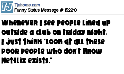 - # 163027 Whenever I see people lined up outside a club on Friday night, I just think “look at all these poor people who don’t know Netflix exists.”