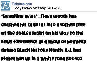 X *Breaking news*...Tiger woods has crashed his Cadillac into another tree at the dogleg right on his way to the news conference. In a show of bravery during Black History Month, O.J. has picked him up in a White Ford Bronco.