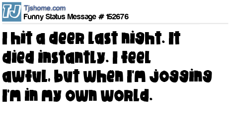 X says I hit a deer last night. It died instantly. I feel awful, but when I'm jogging I'm in my own world.