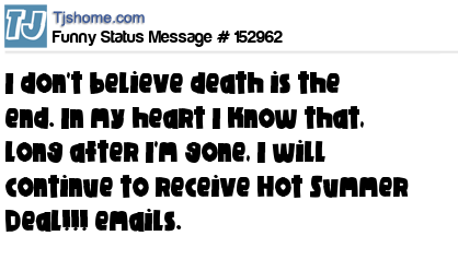 X says I don't believe death is the end. In my heart I know that, long after I'm gone, I will continue to receive Hot Summer Deal!!! emails.