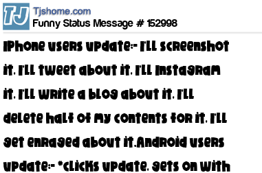 X iPhone users update:- I'll screenshot it, I'll tweet about it, I'll Instagram it, I'll write a blog about it, I'll delete half of my contents for it, I'll get enraged about it.Android users update:- *clicks update, gets on with life*