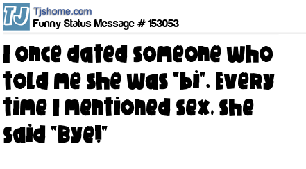 X I once dated someone who told me she was "bi". Every time I mentioned sex, she said "Bye!"