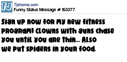 X Sign up now for my new fitness program! Clowns with guns chase you until you are thin... Also we put spiders in your food.