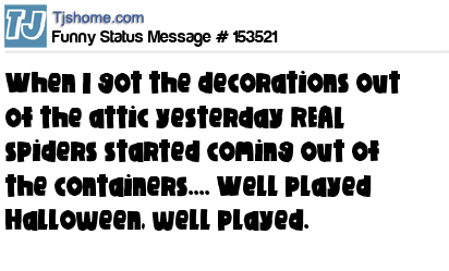 X says When I got the decorations out of the attic yesterday REAL spiders started coming out of the containers.... Well played Halloween, well played.
