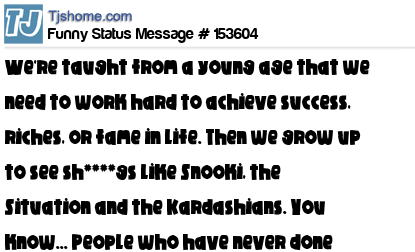 - # 153847 We're taught from a young age that we need to work hard to achieve success, riches, or fame in life. Then we grow up to see shitbags like Snooki, the Situation and the Kardashians. You know... People who have never done anything!