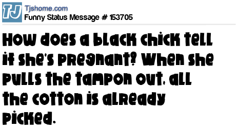 X  How does a black chick tell if she's pregnant? When she pulls the tampon out, all the cotton is already picked.