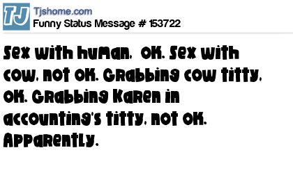 X Sex with human, ok. Sex with cow, not ok. Grabbing cow titty, ok. Grabbing Karen in accounting's titty, not ok. Apparently.