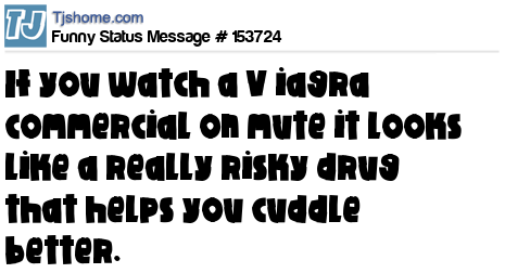 X  If you watch a V iagra commercial on mute it looks like a really risky drug that helps you cuddle better.