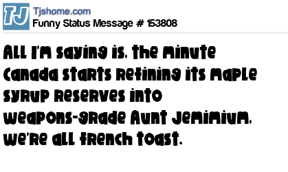X says All I'm saying is, the minute Canada starts refining its maple syrup reserves into weapons-grade Aunt Jemimium, we're all french toast.