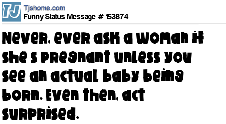 - # 9501 You should never say anything to a woman that even remotely suggests that you think she's pregnant unless you can see an actual baby emerging from her at that moment.