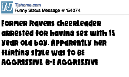X says Former Ravens cheerleader arrested for having sex with 15 year old boy. Apparently her flirting style was to BE AGGRESSIVE, B-E AGGRESSIVE