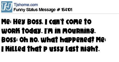 X Me: Hey Boss, I can't come to work today. I'm in mourning. Boss: Oh no, what happened? Me: I killed that p ussy last night.