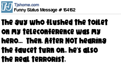 X The guy who flushed the toilet on my teleconference was my hero... Then, After NOT hearing the faucet turn on,, he's also the real terrorist.