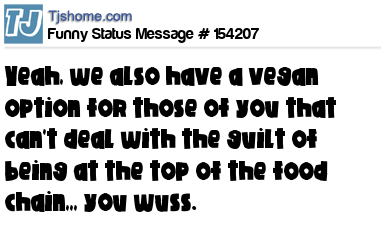 X Yeah, we also have a vegan option for those of you that can't deal with the guilt of being at the top of the food chain,,, you wuss.