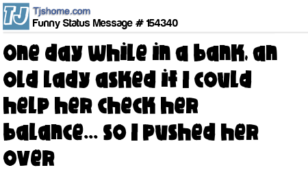 - # 6076 I was at a cash machine when an old lady walked up and asked me to help her check her balance. So I pushed her over.