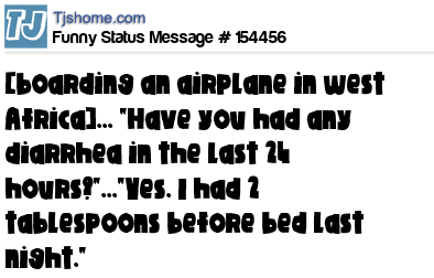 X [boarding an airplane in west Africa]... "Have you had any diarrhea in the last 24 hours?"..."Yes. I had 2 tablespoons before bed last night."
