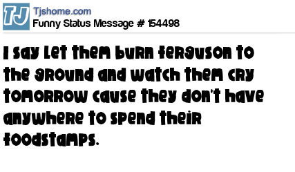 X I say let them burn ferguson to the ground and watch them cry tomorrow cause they don't have anywhere to spend their foodstamps.