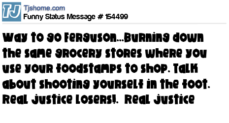 X Way to go Ferguson...Burning down the same grocery stores where you use your foodstamps to shop. Talk about shooting yourself in the foot. Real justice losers!. Real justice