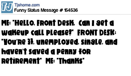 X says ME: "Hello, Front Desk, Can I get a wakeup call please?" FRONT DESK: "You're 37, unemployed, single, and haven't saved a penny for retirement" ME: "Thanks"