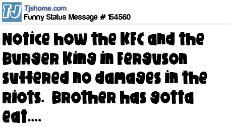 X Notice how the KFC and the Burger King in Ferguson suffered no damages in the riots. Brother has gotta eat....