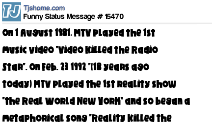 X says On 1 August 1981, MTV played the 1st music video "Video Killed the Radio Star". On Feb. 23 1992 "(18 years ago today) MTV played the 1st reality show "the Real World New York" and so began a metaphorical song "Reality Killed the Video star"!