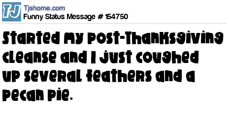 X says Started my post-Thanksgiving cleanse and I just coughed up several feathers and a pecan pie.