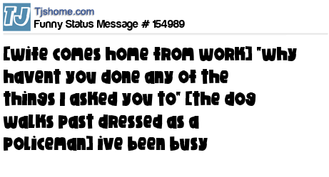 X says [wife comes home from work] "why havent you done any of the things I asked you to" [the dog walks past dressed as a policeman] ive been busy