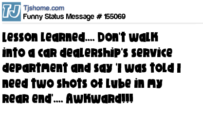 X Lesson learned.... Don't walk into a car dealership's service department and say 'I was told I need two shots of lube in my rear end'.... Awkward!!!