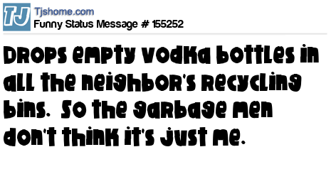 X says Drops empty vodka bottles in all the neighbor's recycling bins. So the garbage men don't think it's just me.