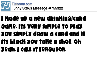 X  I made up a new drinking/card game. Its very simple to play, you simply draw a card and if its black you take a shot. Oh yeah, I call it Ferguson.