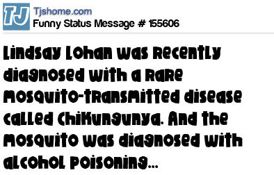 X says Lindsay Lohan was recently diagnosed with a rare mosquito-transmitted disease called Chikungunya. And the mosquito was diagnosed with alcohol poisoning...