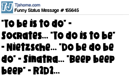 X "To be is to do" - Socrates... "To do is to be" - Nietzsche... "Do be do be do" - Sinatra... "Beep beep beep" - R2D2...