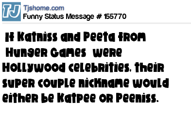X If Katniss and Peeta from “Hunger Games” were Hollywood celebrities, their super couple nickname would either be Katpee or Peeniss.”