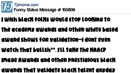 X says I wish black folks would stop looking to the academy awards and other white based award shows for validation--i dont even watch that bullsh**. I'll take the NAACP Image Awards and other prestigious black awards that validate black talent anyday over the o