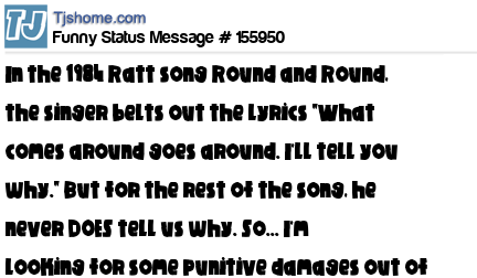 X says In the 1984 Ratt song Round and Round, the singer belts out the lyrics "What comes around goes around. I'll tell you why." But for the rest of the song, he never DOES tell us why. So... I'm looking for some punitive damages out of this 31 year old false p