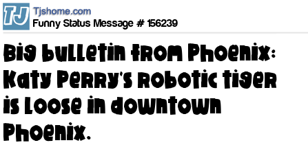 X says Big bulletin from Phoenix: Katy Perry's robotic tiger is loose in downtown Phoenix.