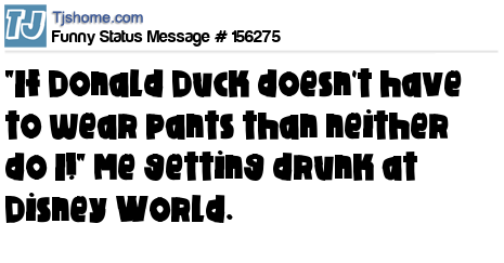 X says "If Donald Duck doesn't have to wear pants than neither do I!" Me getting drunk at Disney World.
