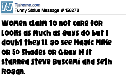 X says Women claim to not care for looks as much as guys do but I doubt they'll go see Magic Mike or 50 Shades or Gray if it starred Steve Buscemi and Seth Rogan.