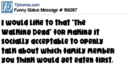 X says I would like to that "The Walking Dead" for making it socially acceptable to openly talk about which family member you think would get eaten first.