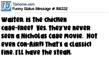 X says Waiter, is the chicken cage-free? Yes, they've never seen a Nicholas Cage movie. Not even Con-Air?! That's a classic! Fine, I'll have the steak.
