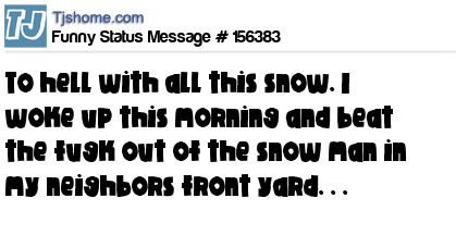 X says To hell with all this snow. I woke up this morning and beat the fugk out of the snow man in my neighbors front yard. . .