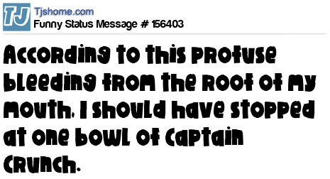 X says According to this profuse bleeding from the roof of my mouth, I should have stopped at one bowl of Captain Crunch.