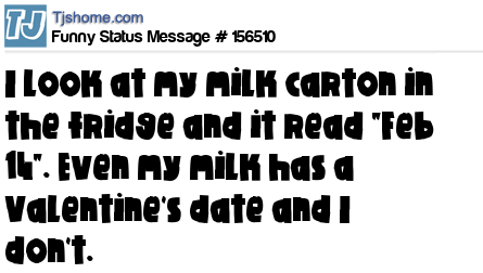 X  I look at my milk carton in the fridge and it read "Feb 14". Even my milk has a Valentine's date and I don't.