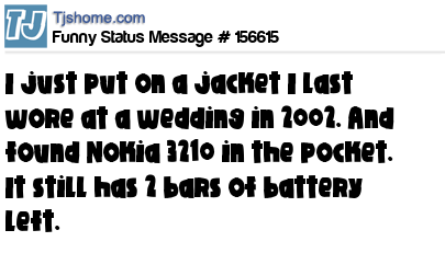 X says I just put on a jacket I last wore at a wedding in 2002. And found Nokia 3210 in the pocket. It still has 2 bars of battery left.