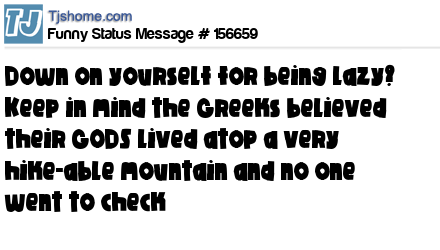 - # 136699 Down on yourself for being lazy? Keep in mind the Greeks believed their GODS lived atop a very hikeable mountain and no one went to check.